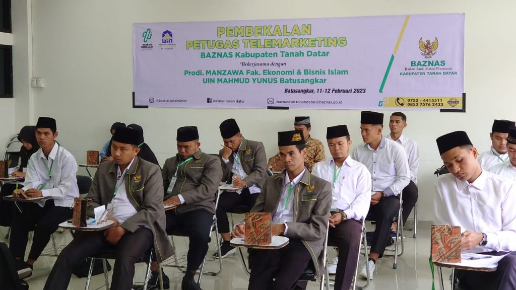 Kegiatan pembekalan Tele Marketing ini diikuti oleh mahasiswa Program Studi Manajemene Zakat dan Wakaf dan para ‘amil BAZNAS Kab. Tanah Datar. Kegiatan ini dibuka langsung oleh Ketua BAZNAS Kab. Tanah Datar Bapak Yasmansyah, S.Ag.,M.Pd dan Dekan Fakultas Ekonomi dan Bisnis Islam UIN Mahmd Yunus Batusangkar Bapak Dr. H. Rizal, M.Ag.,CRP. Dalam Sambuatnnya Ketua BAZNAS menyatakan bahwa kita perlu memiliki petugas tele marketing yang kompeten yang paham tentang zakat dan marketing zakat dengan melihat potensi zakat yang sangat besar di Kabupaten Tanah Datar. Untuk itulah kita datangkan pemateri yang kompeten dibidang zakat dan dibidang marketing agar potensi zakat di daerah kita dapat dikumpulkan secara optimal. Dalam Kegiatan ini juga mendatangkan dua orang dosen Program Studi Manajemen Zakat dan Wakaf yang sekaligus menjadi pemateri yaitu Bapak Drs. H. Emrizal, MM dan Bapak Widi Nopiardo, S.EI.,MA